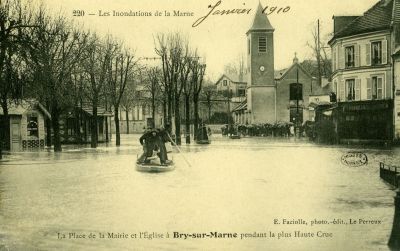 Place de la Mairie et de l'église à Bry-sur-Marne pendant la plus haute crue de 1910