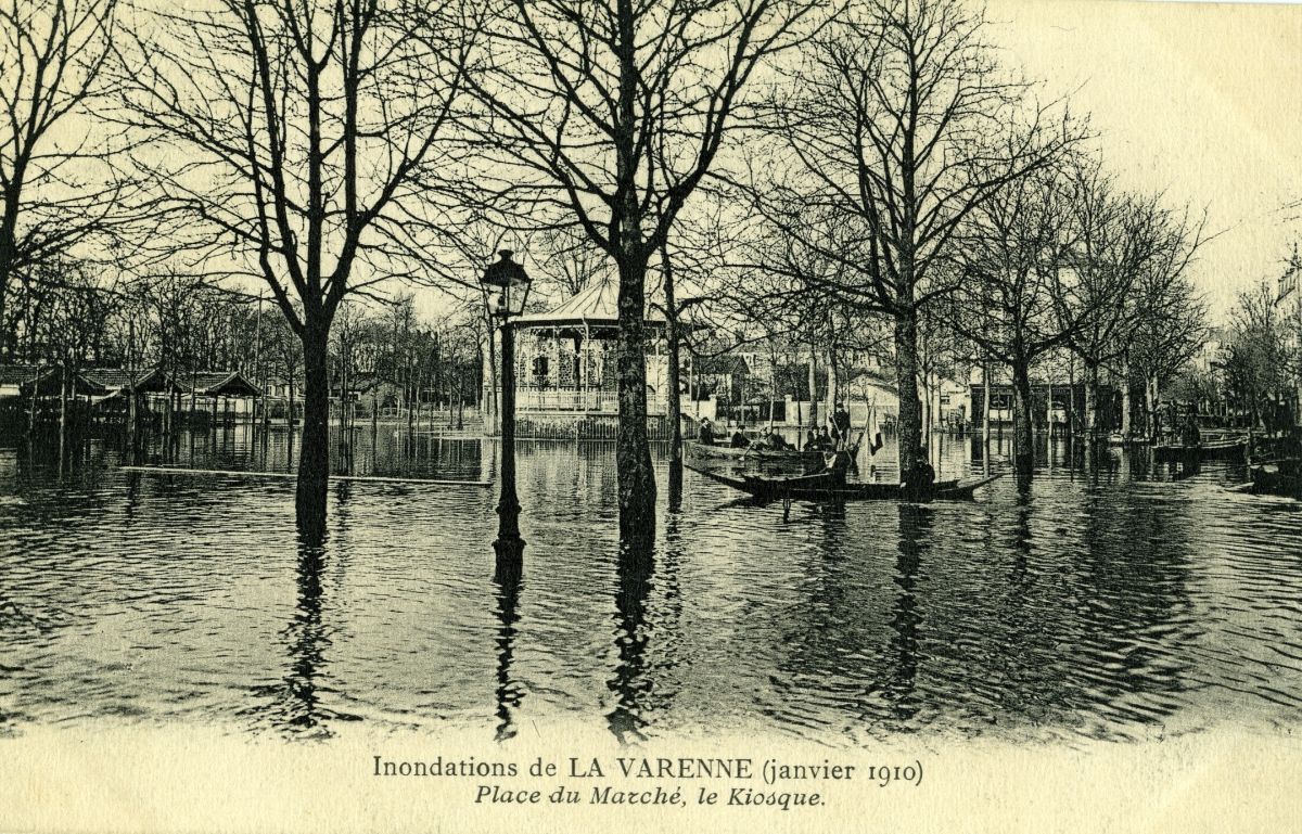 Inondations de la Varenne - Place du marché, le kiosque